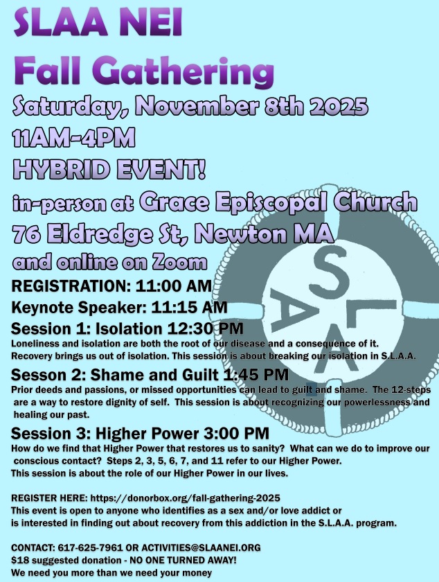 Join New England Intergroup (NEI) for our Fall Gathering on Saturday November 8th from 11am to 4:00PM EST. It is a hybrid event on Zoom and in person.